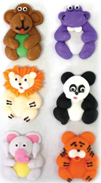 Pack of 6 edible sugar assorted Safari characters Hippo: 3CMx3CMx1CM Monkey: 3.5CMx3CMx1CM Panda: 3CMx3.5CMx1CM Tiger: 3CMx3CMx1CM Elephant: 3.5CMx...